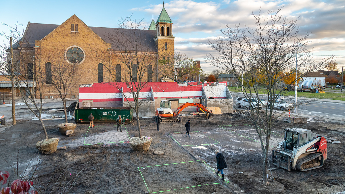 Core City Park under construction in Detroit, Michigan. The design added green spaces and new local businesses to a distressed commercial corridor.