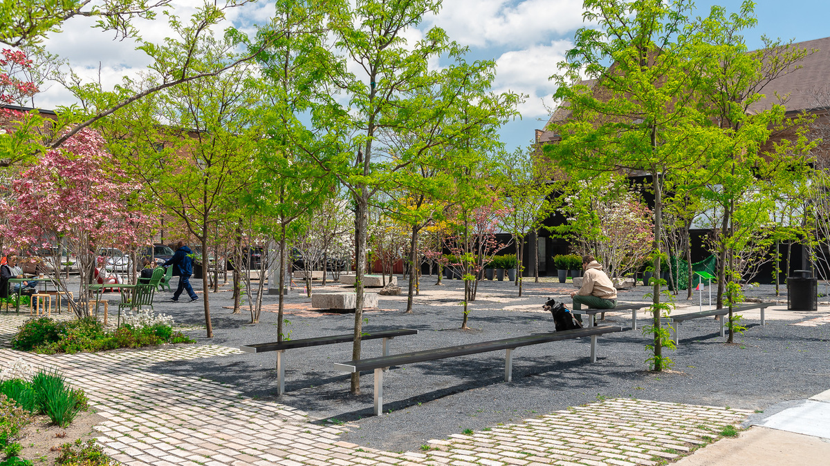 A desolate parking lot full of weeds and debris has been converted into Core City Park in Detroit, Michigan. Almost everything that was used in the construction of the park was found on site – the benches, for example, were recycled from old concrete walls. Prince Concepts and the Cultural Landscape Foundation. Hide caption